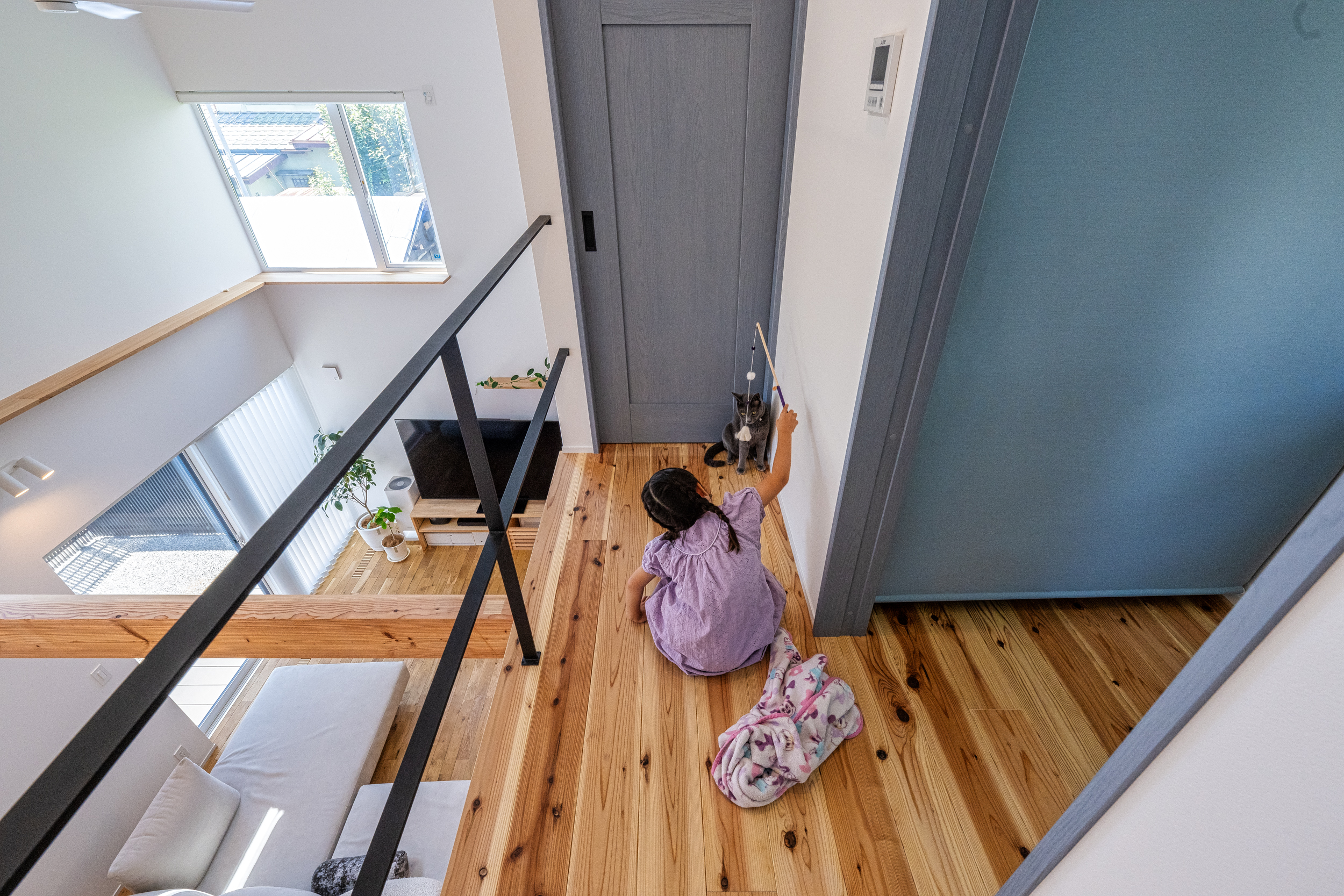 吹き抜けに設けた化粧梁は、猫のグラちゃん専用の通り道に。